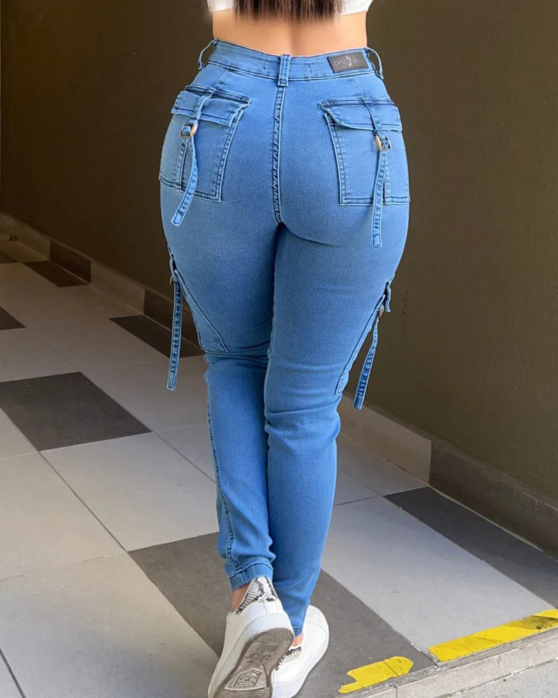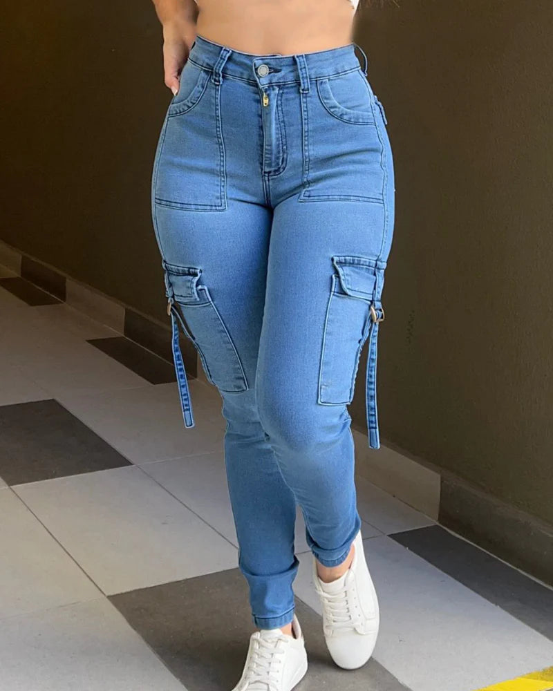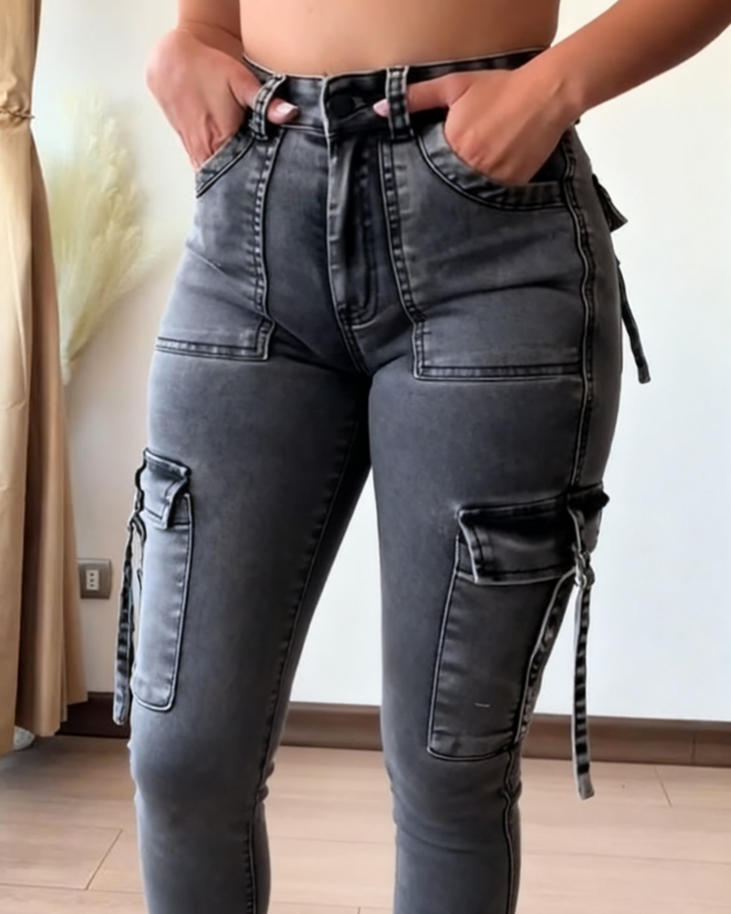What sets these jeans apart is the addition of cargo-inspired details. The cargo pockets on the sides provide a touch of utility and a fashionable twist. They not only add visual interest but also offer extra storage space for your essentials, giving you a practical and trendy option. With their versatile style, these jeans can be paired with a variety of tops and shoes.